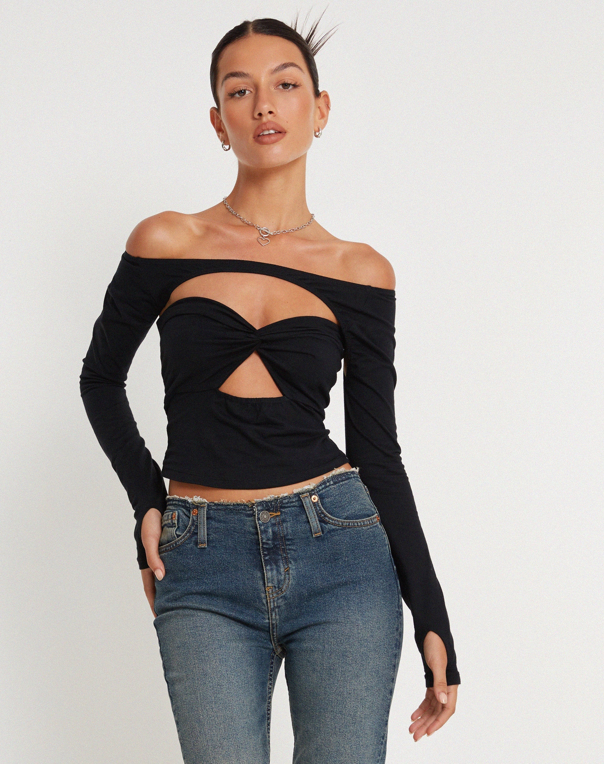 Bandi Long Sleeve High Neck Cut Out Top in Black