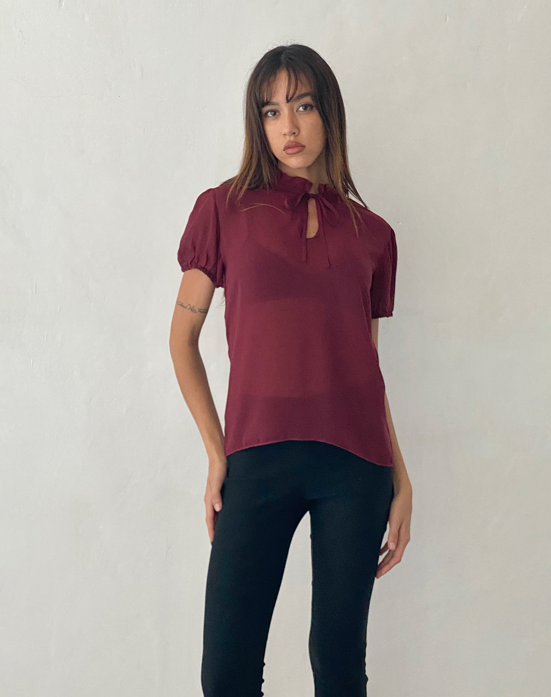 Enzo High Neck Blouse in Oxblood Chiffon