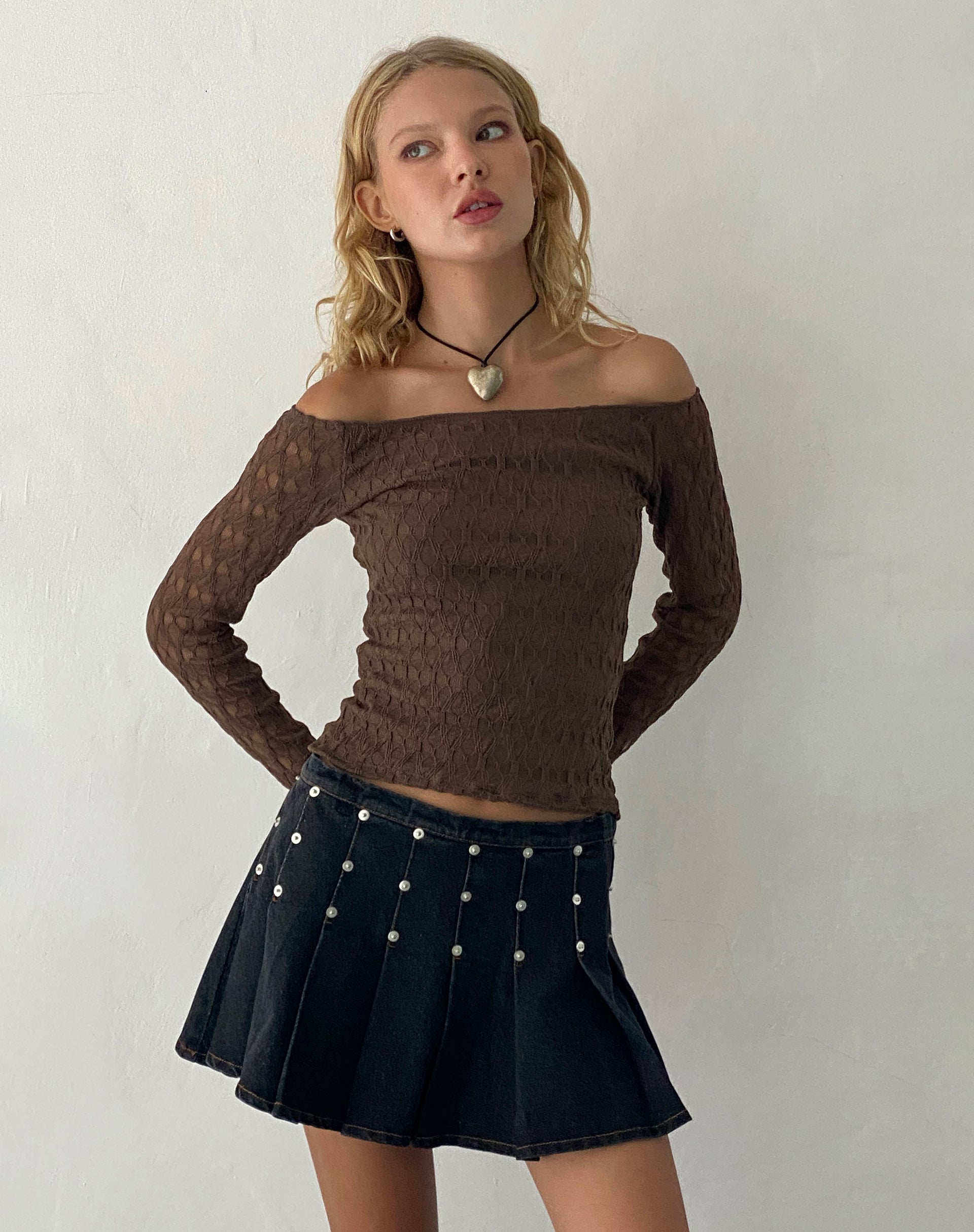Neira Long Sleeve Bardot Top in Textured Knit Mocha