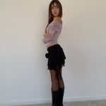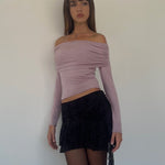 Long sleeve bardot top in a slinky mauve fabric featuring ruching at the shoulder. We love to style with our Theri mini skirt.