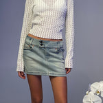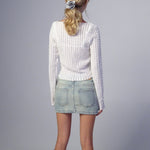 Get ready for those chiller nights with our Angela top. In a white unlined crinkled fabric featuring long sleeves and boat neckline. Complete the look with a denim mini.