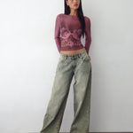 The perfect addition to your ghoul girl aesthetic. In a burgundy the Armali top featuring a long sleeve fit with wide crew neckline in mesh, with a lace bra scan print. We love to style with our Roomy low rise jeans.