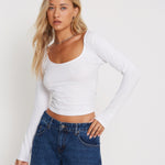 Basic long sleeve top in white with scoop neckline and cropped fit. Complete the look with our Roomy jeans.