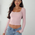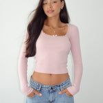 A scoop neck long sleeve top in a soft 2x1 rib fabric, featuring a lace trim along neckline and finished with a tonal bow at the centre front. Pair with our raw hem Roomy jeans.