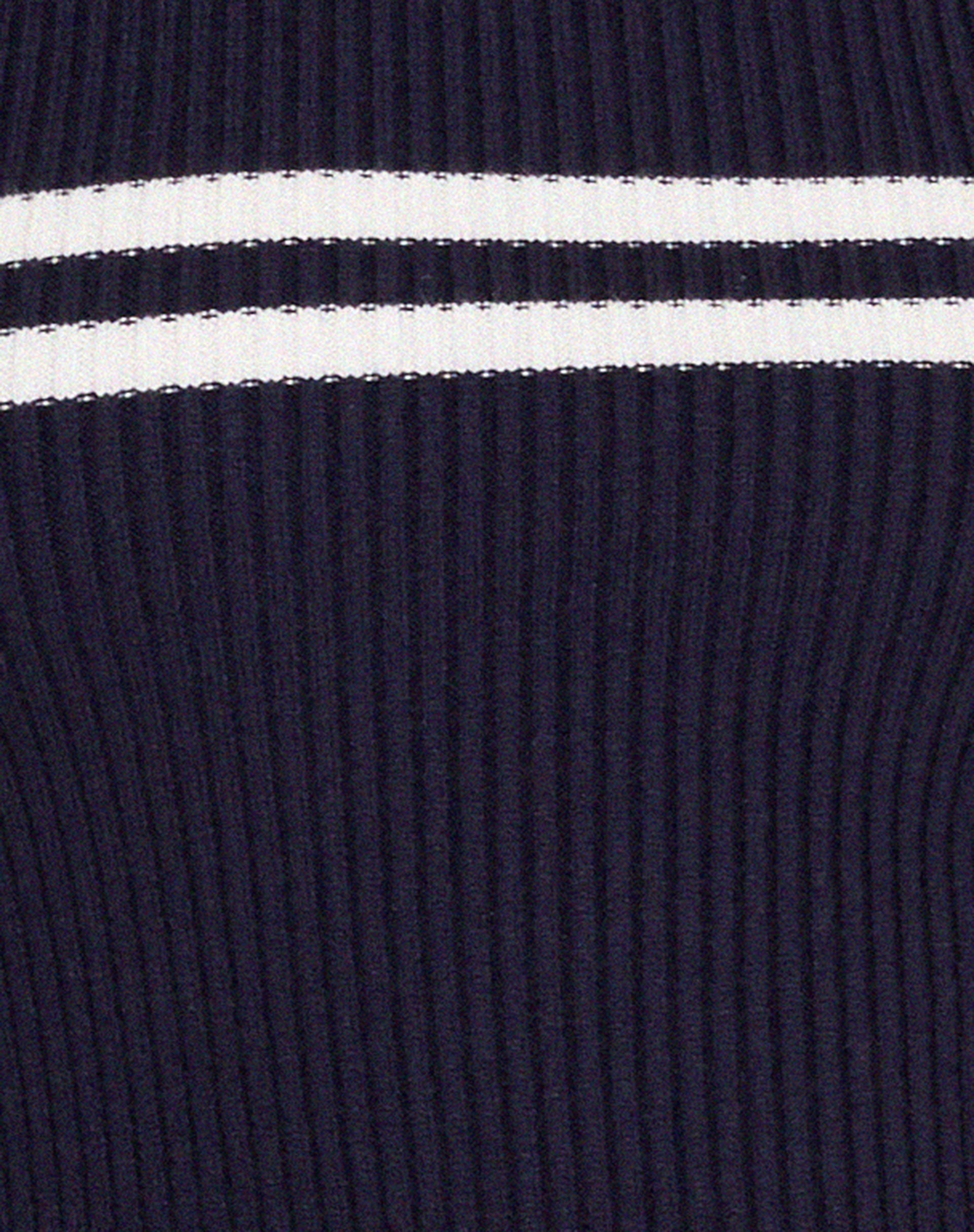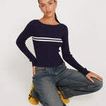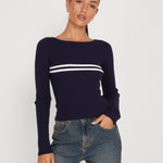 Long sleeve knitted top in navy, featuring two white stripes on the front and a regular fit. Complete the 'fit with our Roomy jean.
