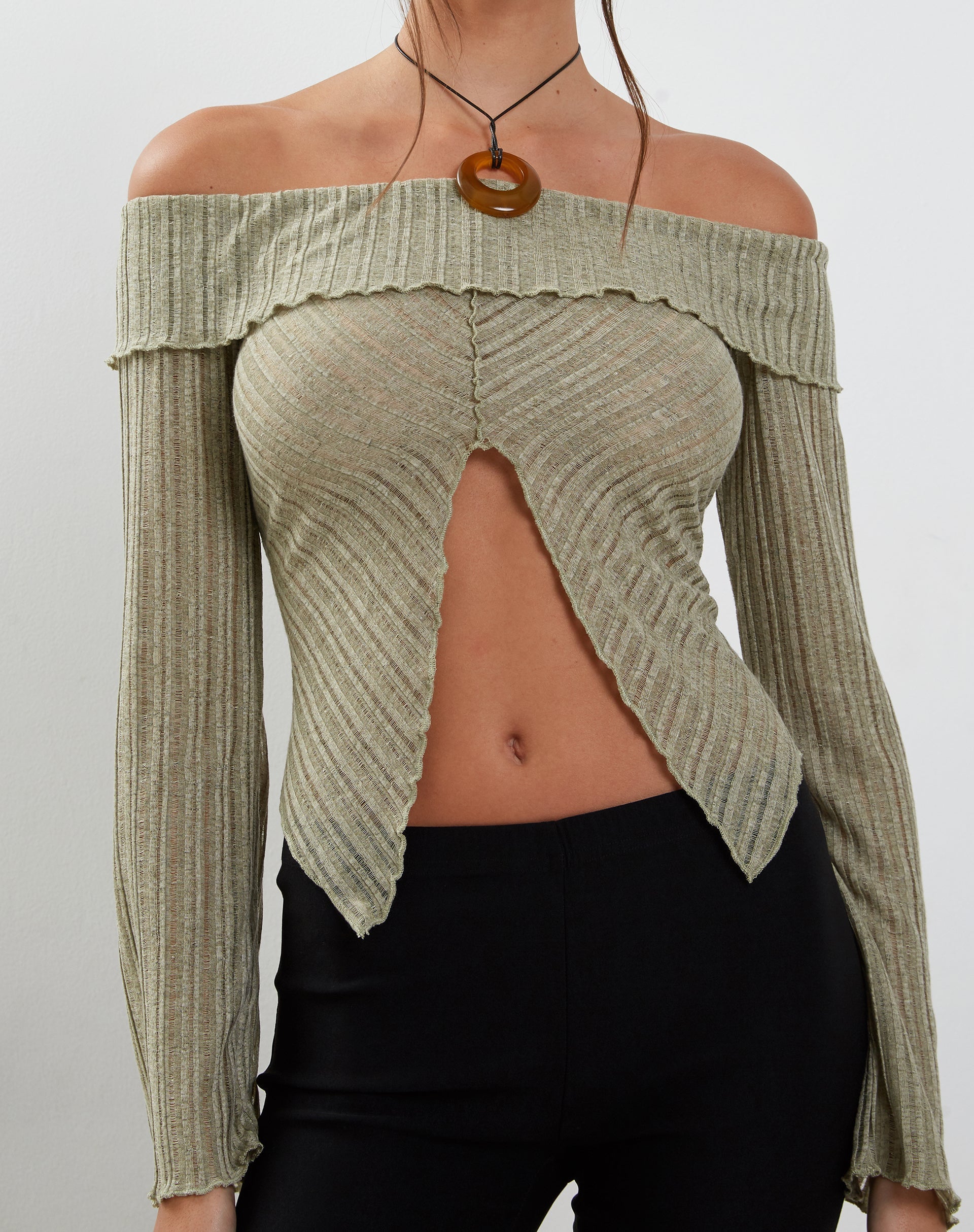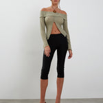 Our newest knit is here! The Celeste top features an off shoulder design with long sleeves and a V slit detail at front, in a sage knit. We love to wear with our Shine capri pants.