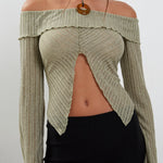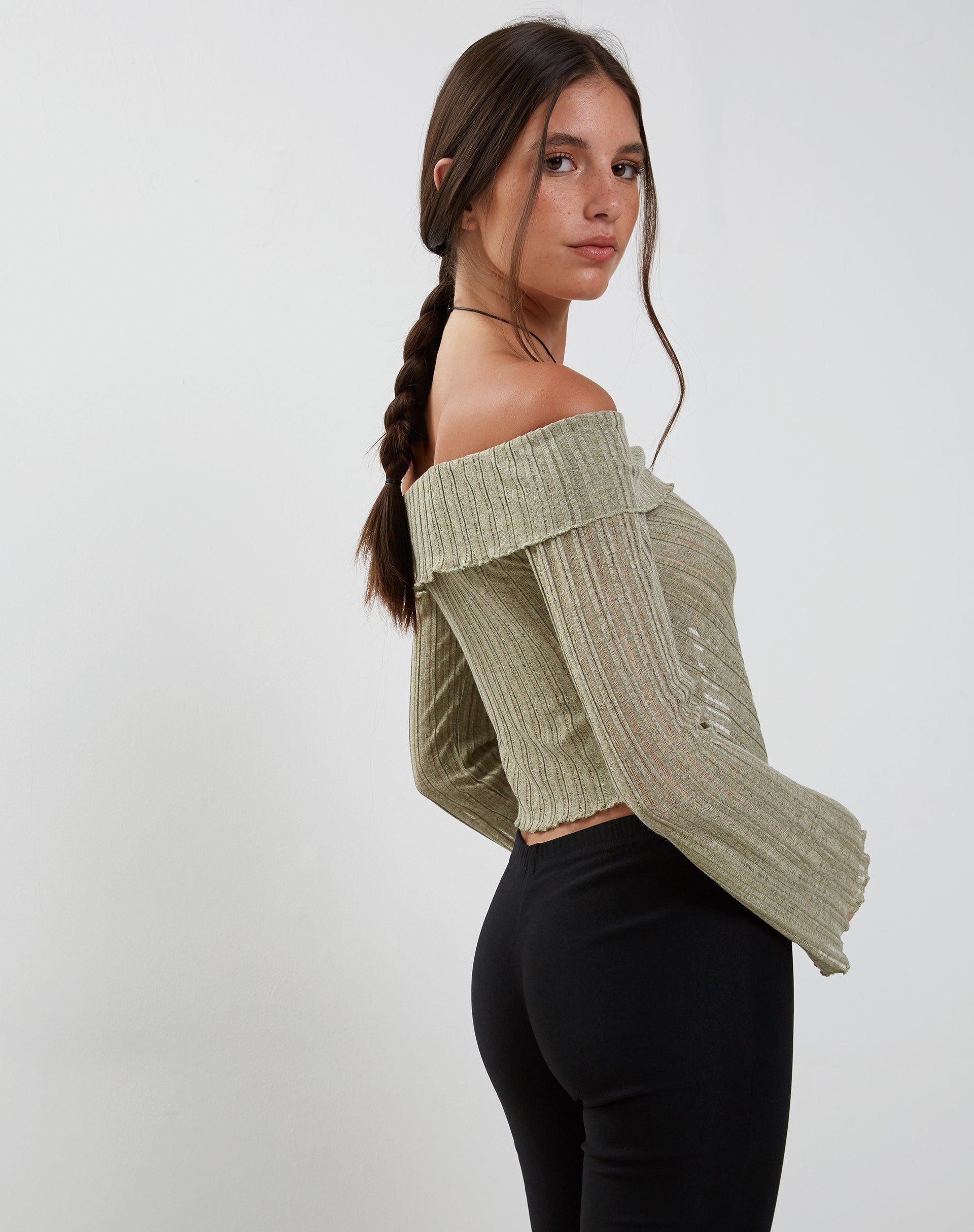 Celeste Long Sleeve Bardot Knitted Top in Sage