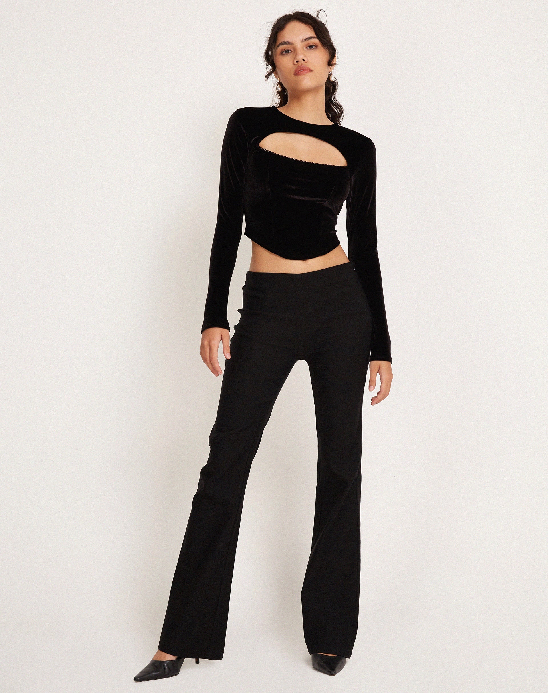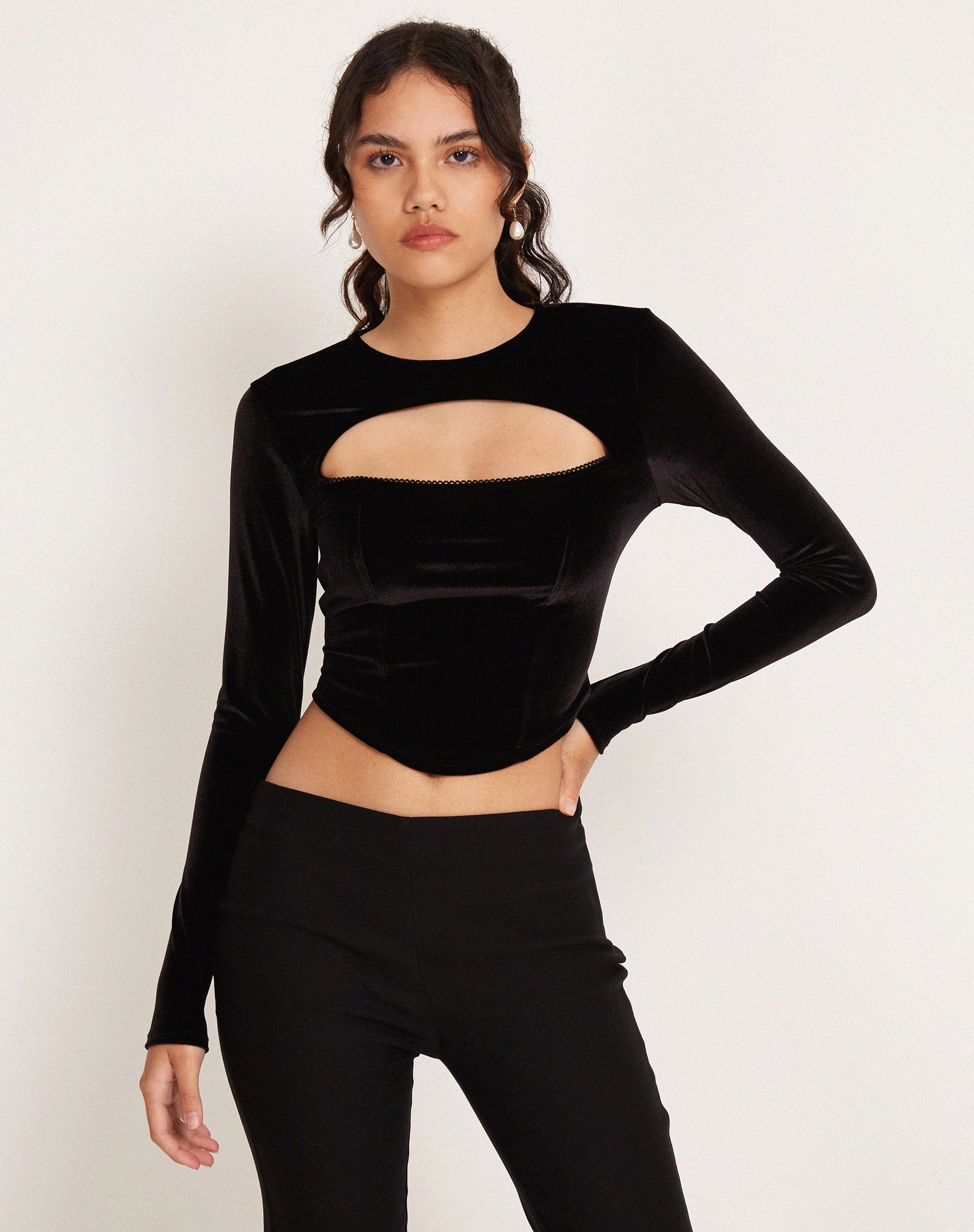 Long sleeve top, in black velvet. Featuring boning detail with corset fit and crew neckline with cut out detail. Pair with our Ifa skirt for a complete 'fit.