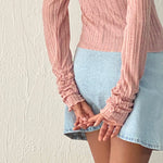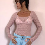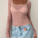 The Halsey Top features long sleeves, a square neckline and comes in a pink knitted ribbed material. Style with our Mini A-line Skirt.