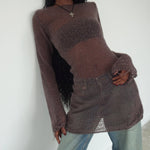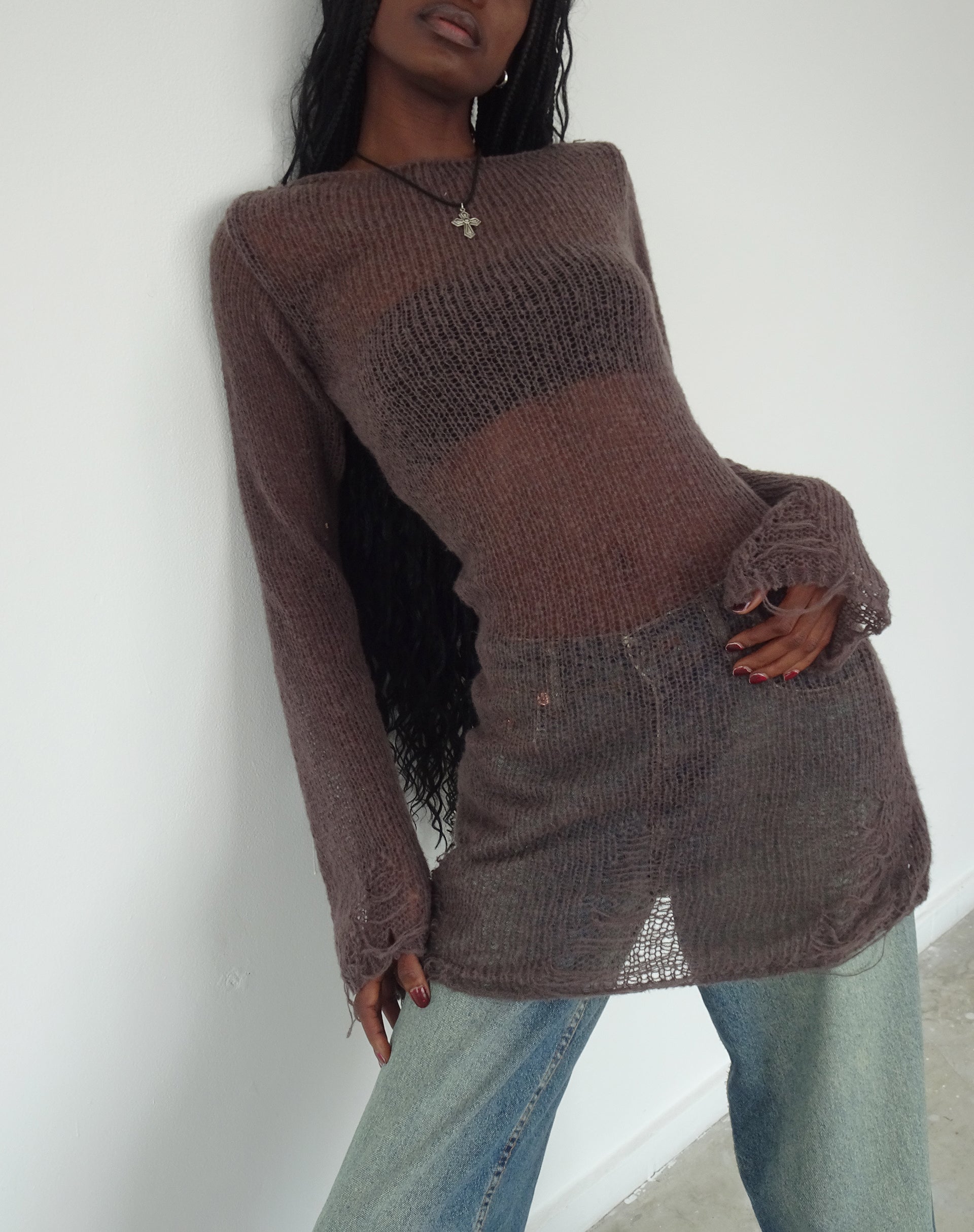 Our Harper dress features a mini length, asymmetric, fairy-like hem with long sleeves and a boat neckline in a maroon knitted fabric. Detailed with a raw frayed edge and laddered godets.