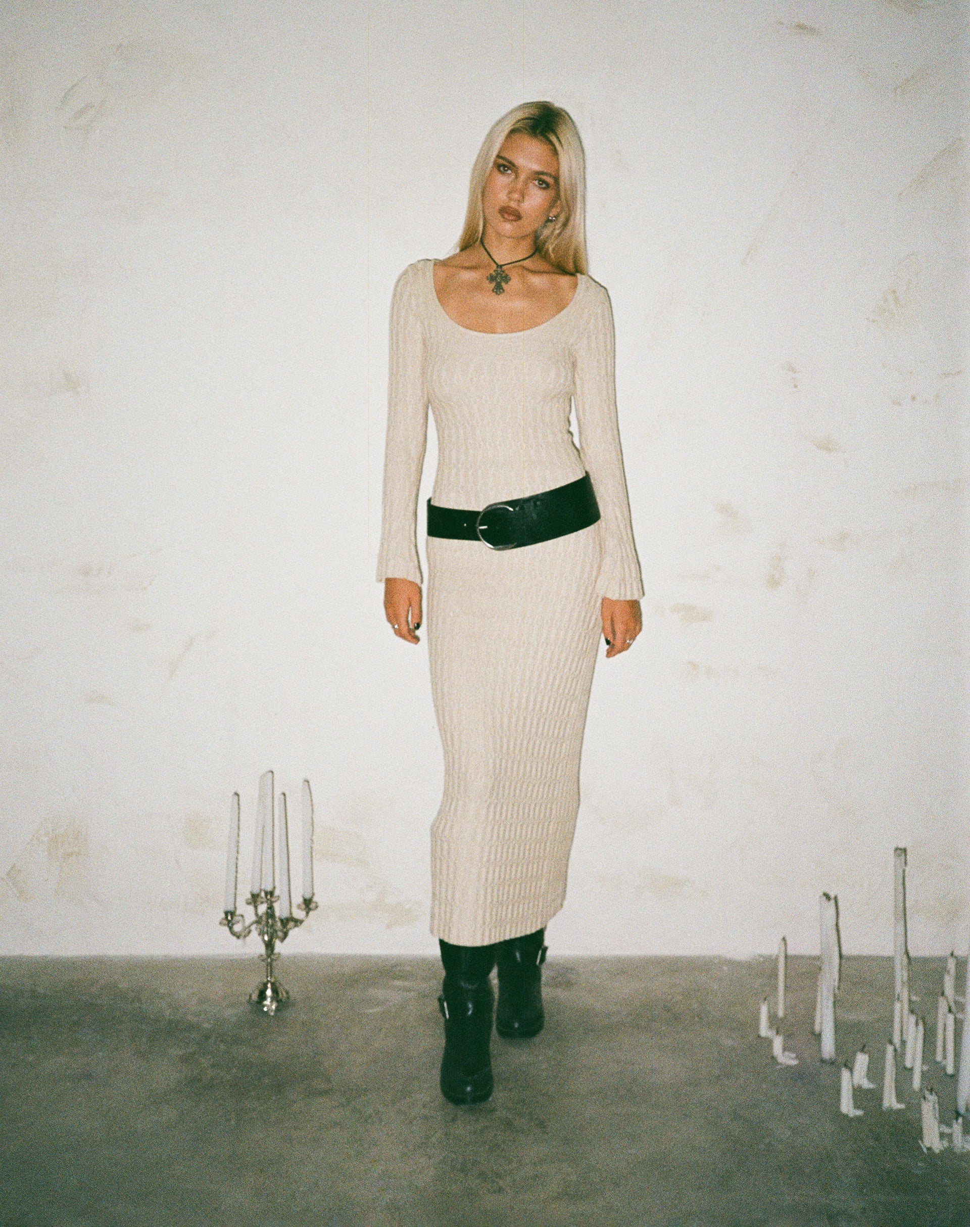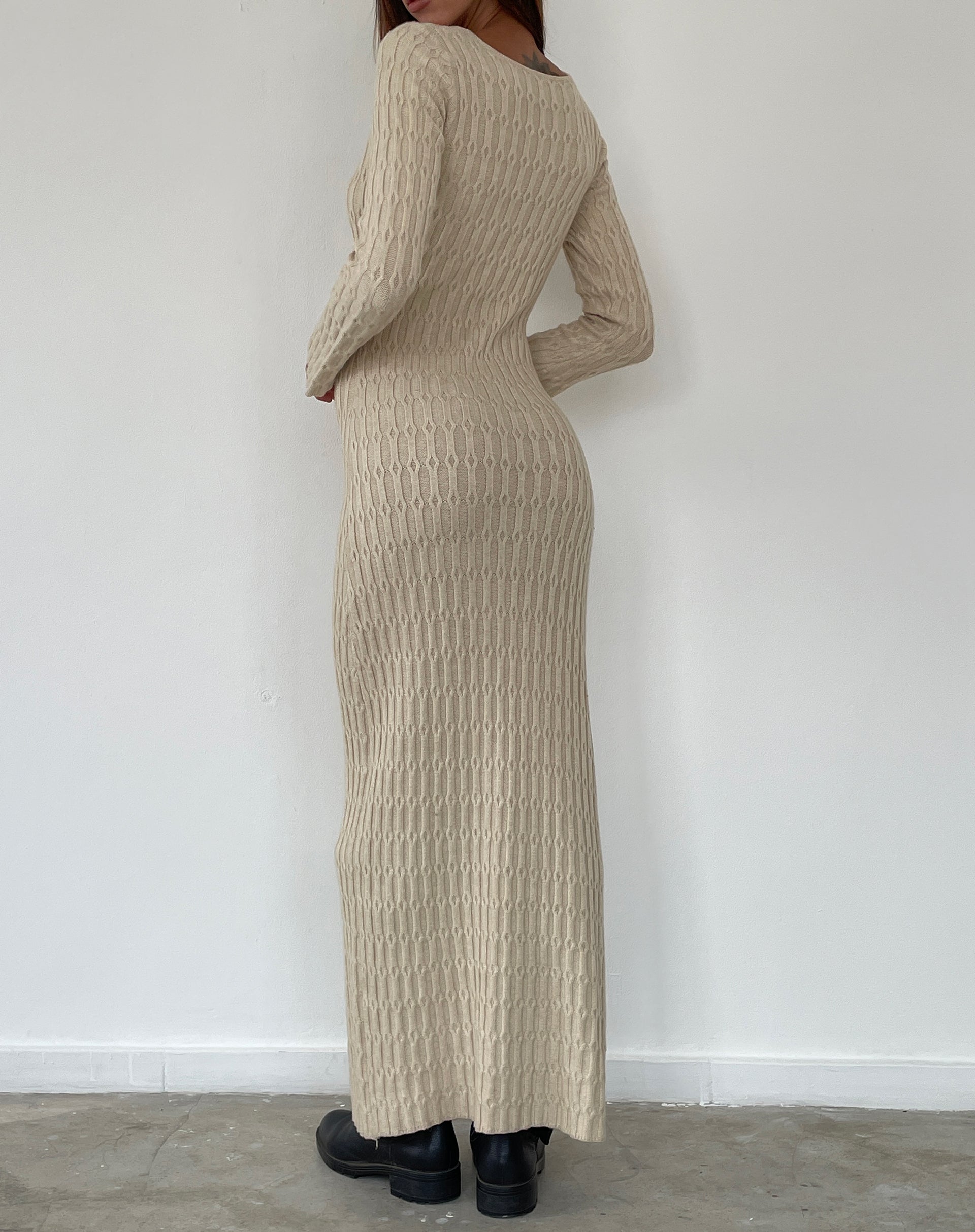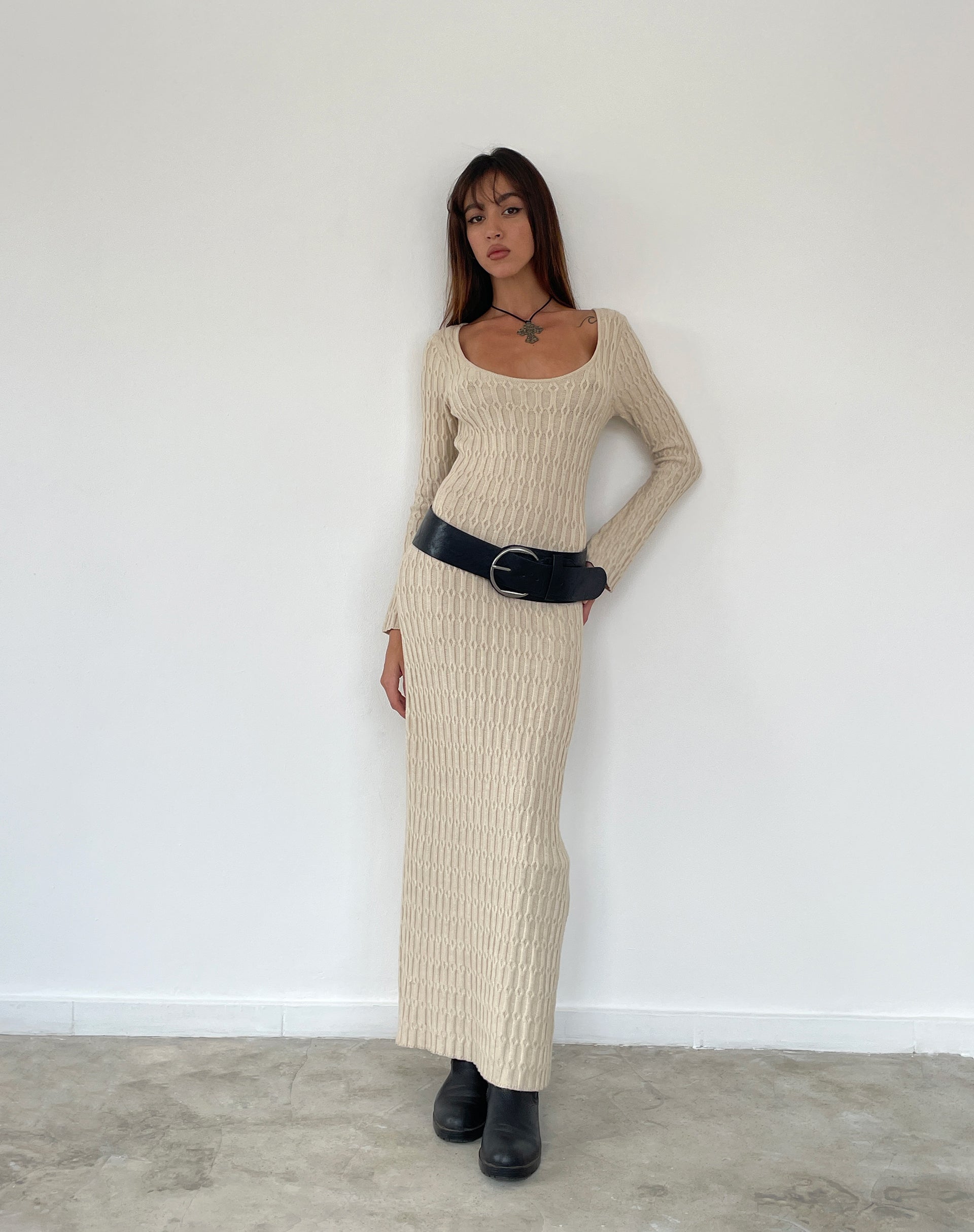In a light taupe 3D waffle knit, the Kiasta dress boasts a fitted silhouette with a maxi length hem, long sleeves and a flattering scooped neckline.