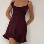 Litera Dress is a stylish strappy scoop neck ruffle mini dress. It showcases an off-centre V dipped panel at the hem with a godet insert. The dress is adorned with two clusters of rosettes at the neck and hem, and loose hanging chiffon in deep plum.