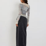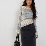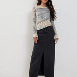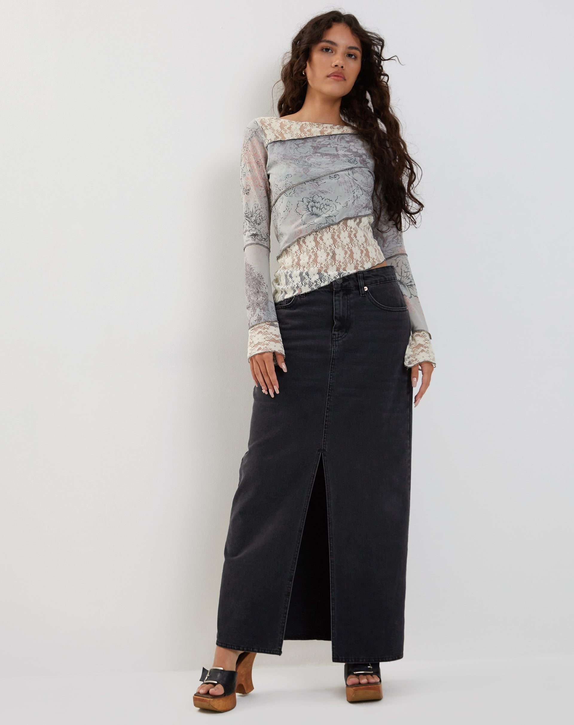 Our latest version of Lucca is here. Featuring a floral print, long poet sleeves and a boat neckline. Finished with an asymmetric hem in a lace material. Complete the look with our Denim Maxi Skirt.