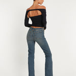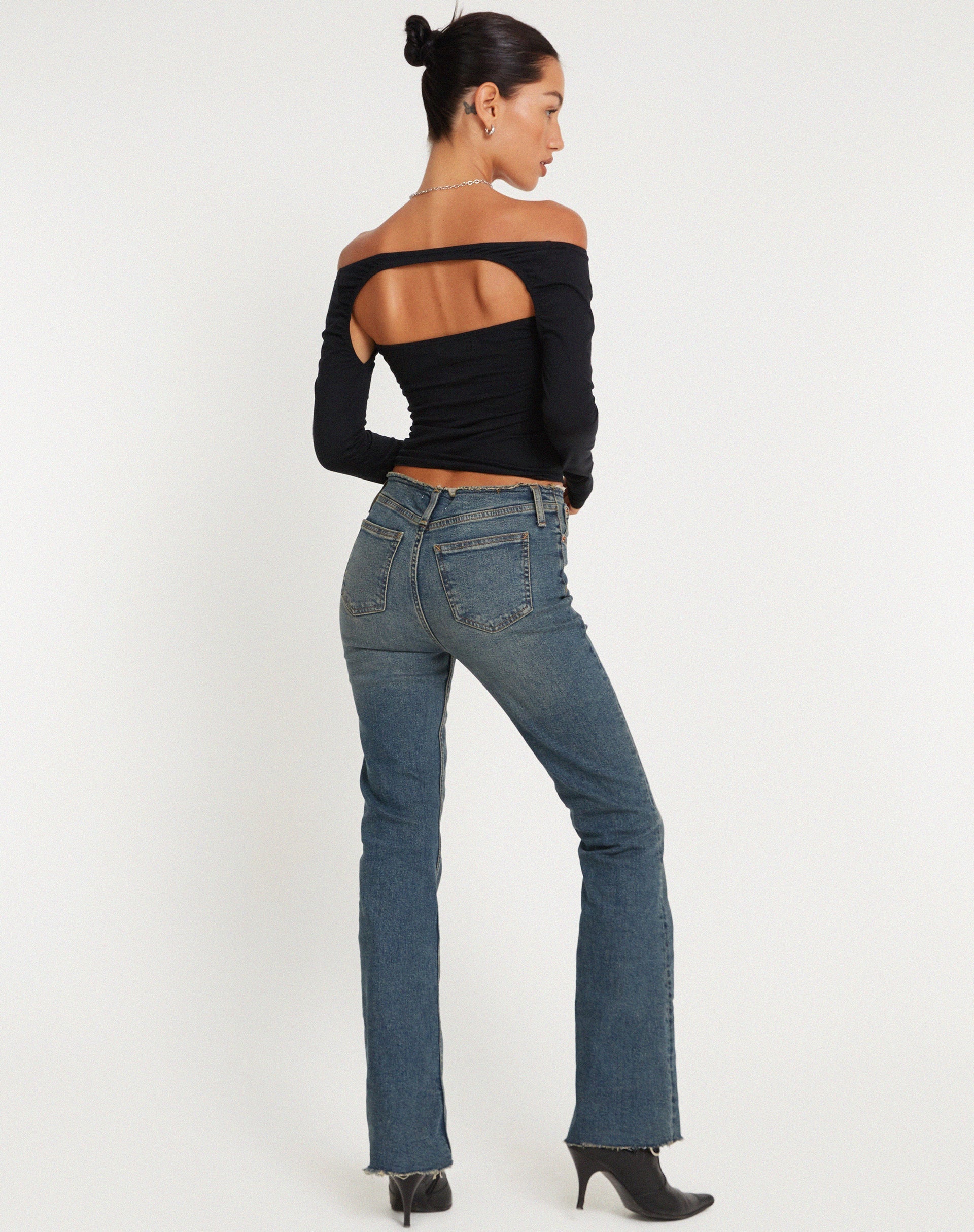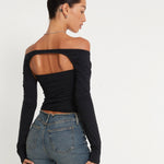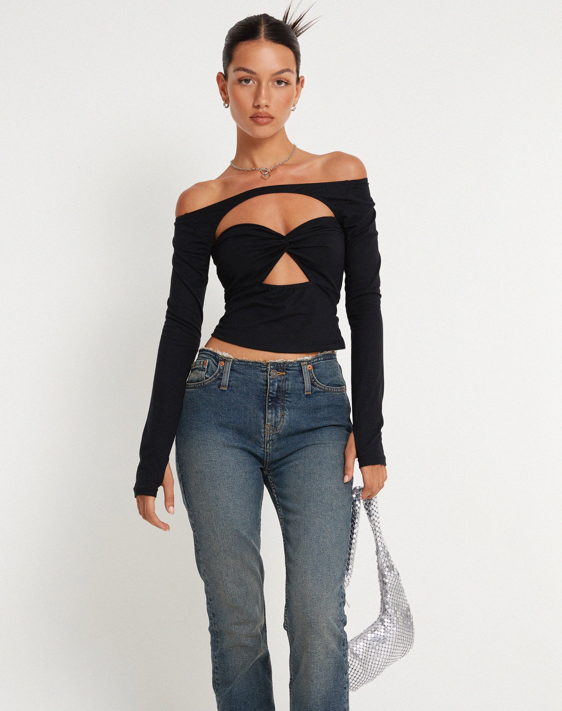 A wardrobe must have item. A black jersey two piece with long sleeve shrug design and cut out detailing bandeau top, with ruched detailing on the bust. Pair with our Frayed Low Rise jeans for the perfect outfit.