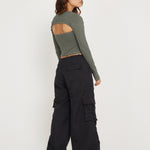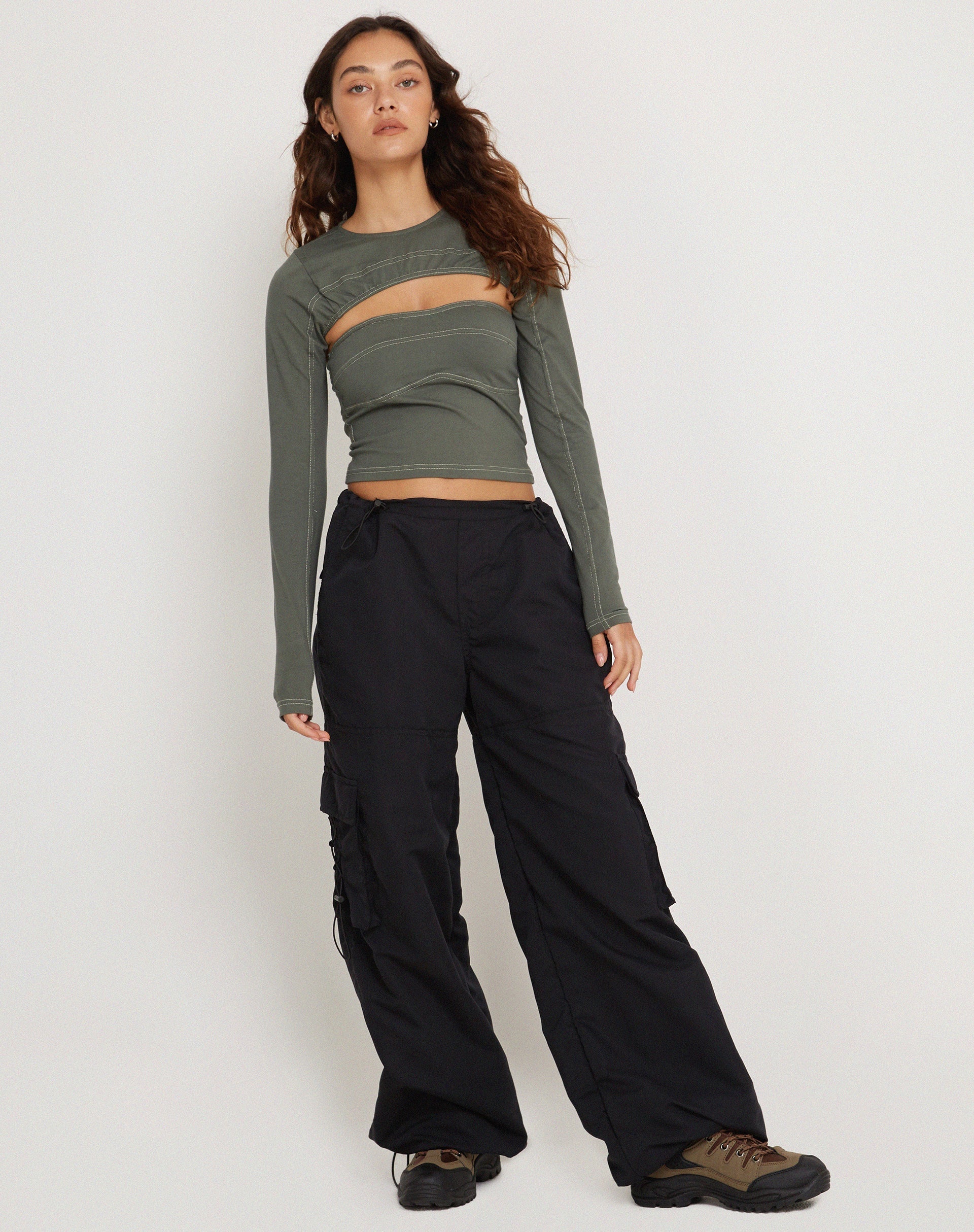 Keep it casual with our Matea top. In a duck green lycra fabric, it features a cropped fit with long, detachable sleeves, a crew neckline and cut-out to bust. Detailed with yellow top stitching. We love to style with our Fabio trouser.