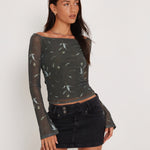 Neira Long Sleeve Mesh Bardot Top in Floral Khaki Silhouette