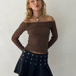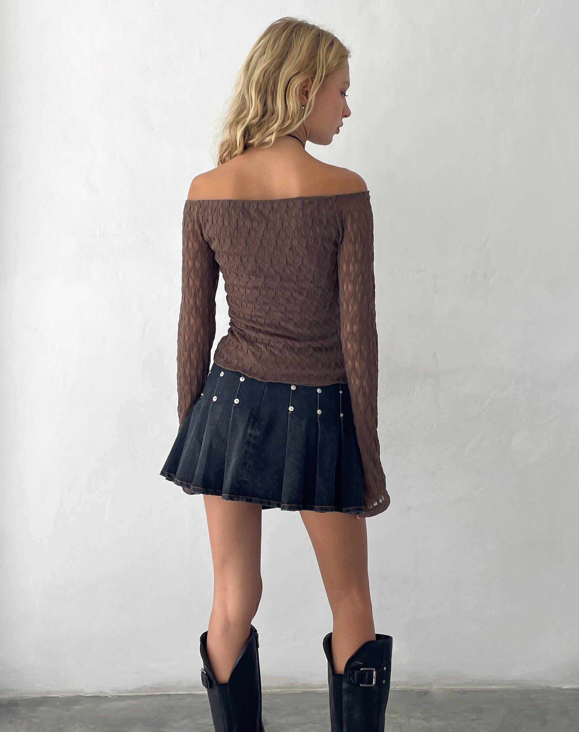 Neira, in Mocha, features long flared sleeves and a bardot neckline in a textured knit. Style with our Gatlin pleated mini.