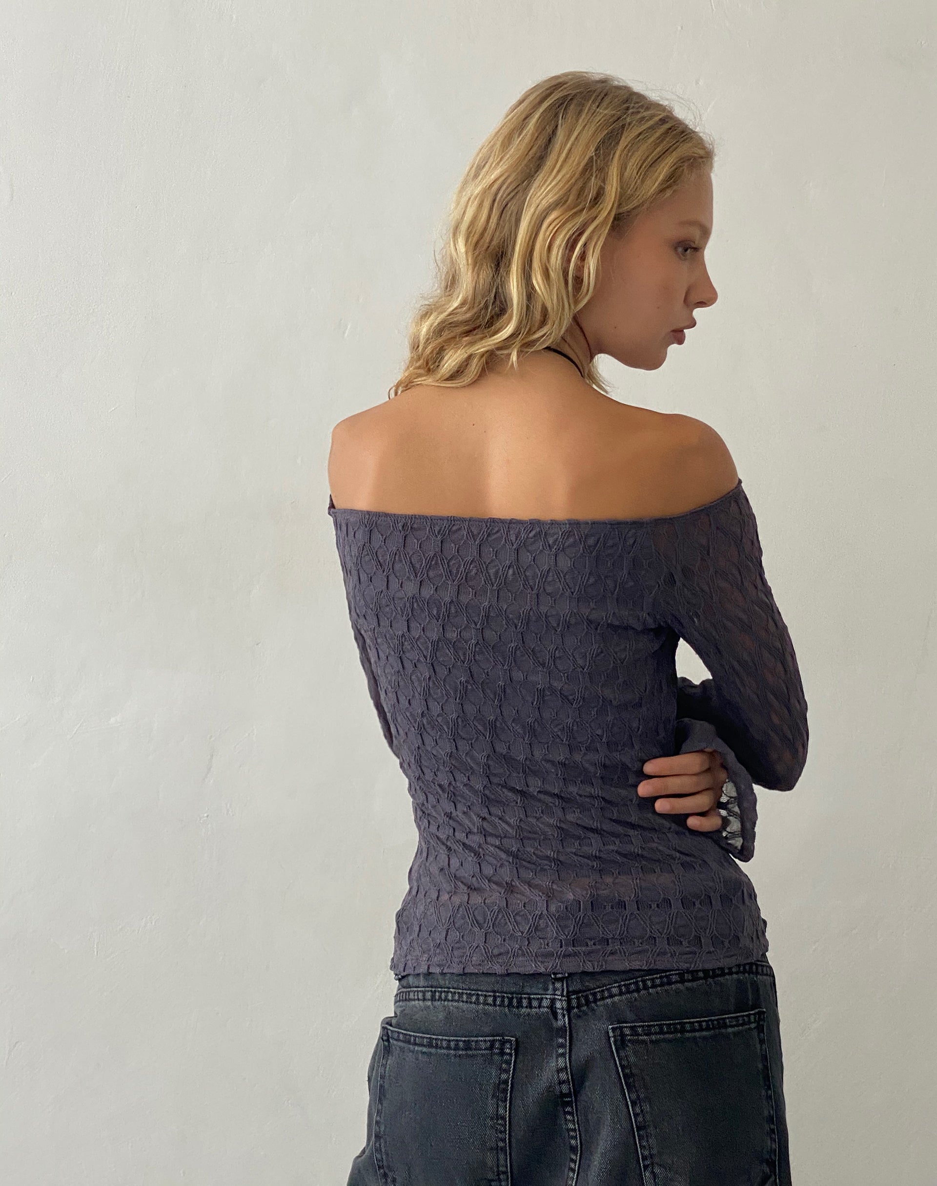 Neira Long Sleeve Bardot Top in Textured Knit Ocean Storm