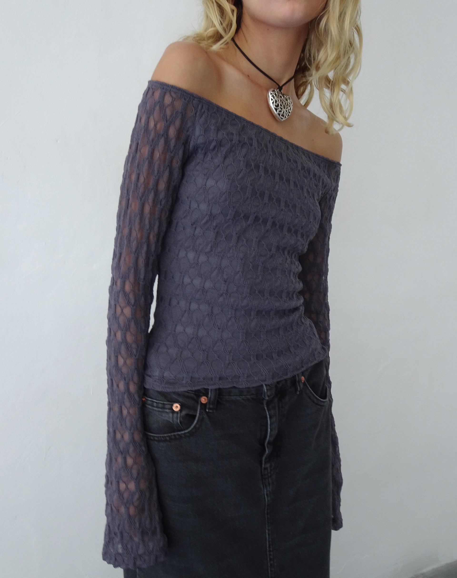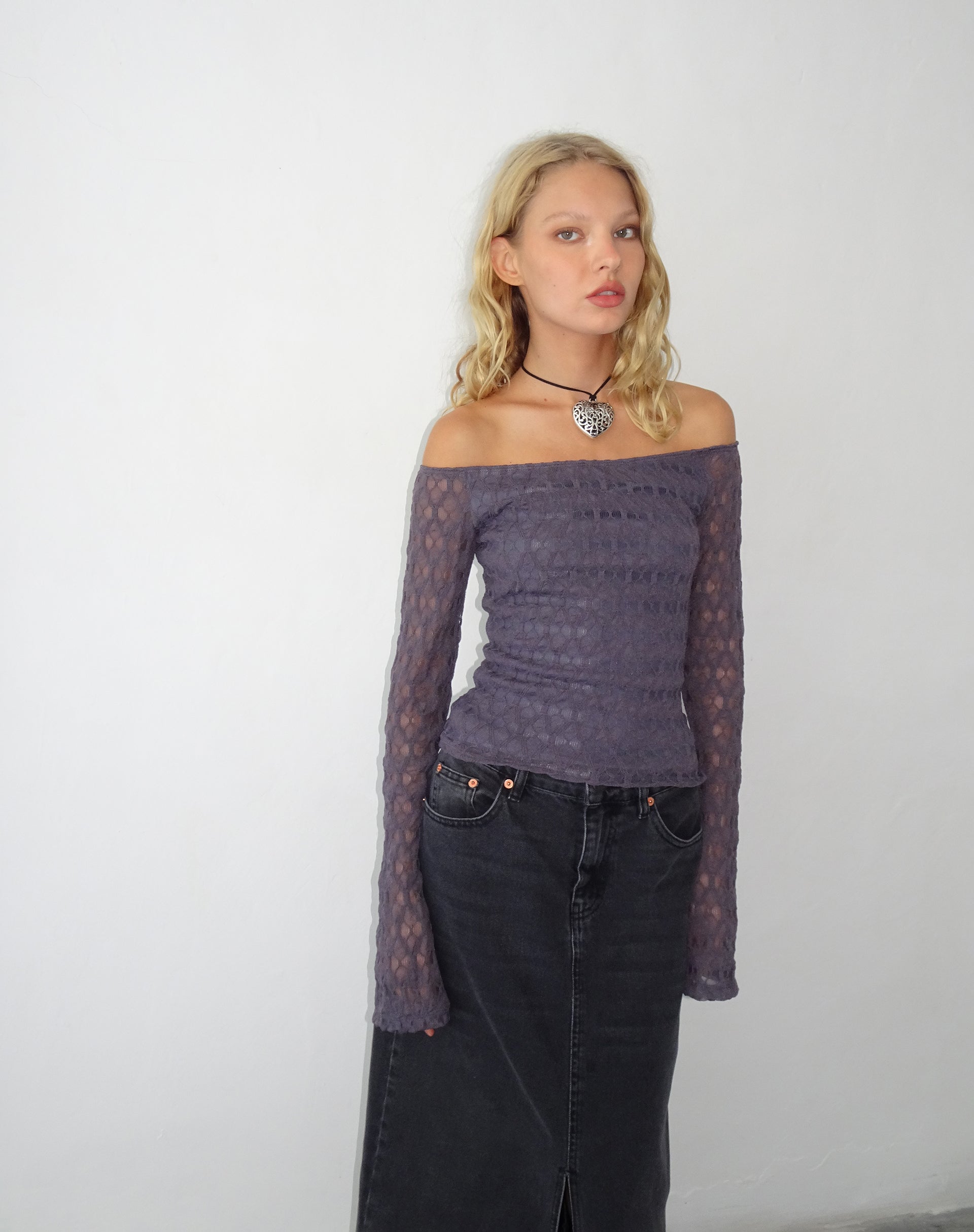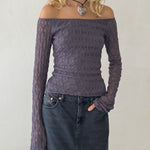 Off the shoulder is trending. The Neira top, in textured knit ocean storm, features a bardot neckline with long sleeves. We've styled ours with a denim maxi skirt.