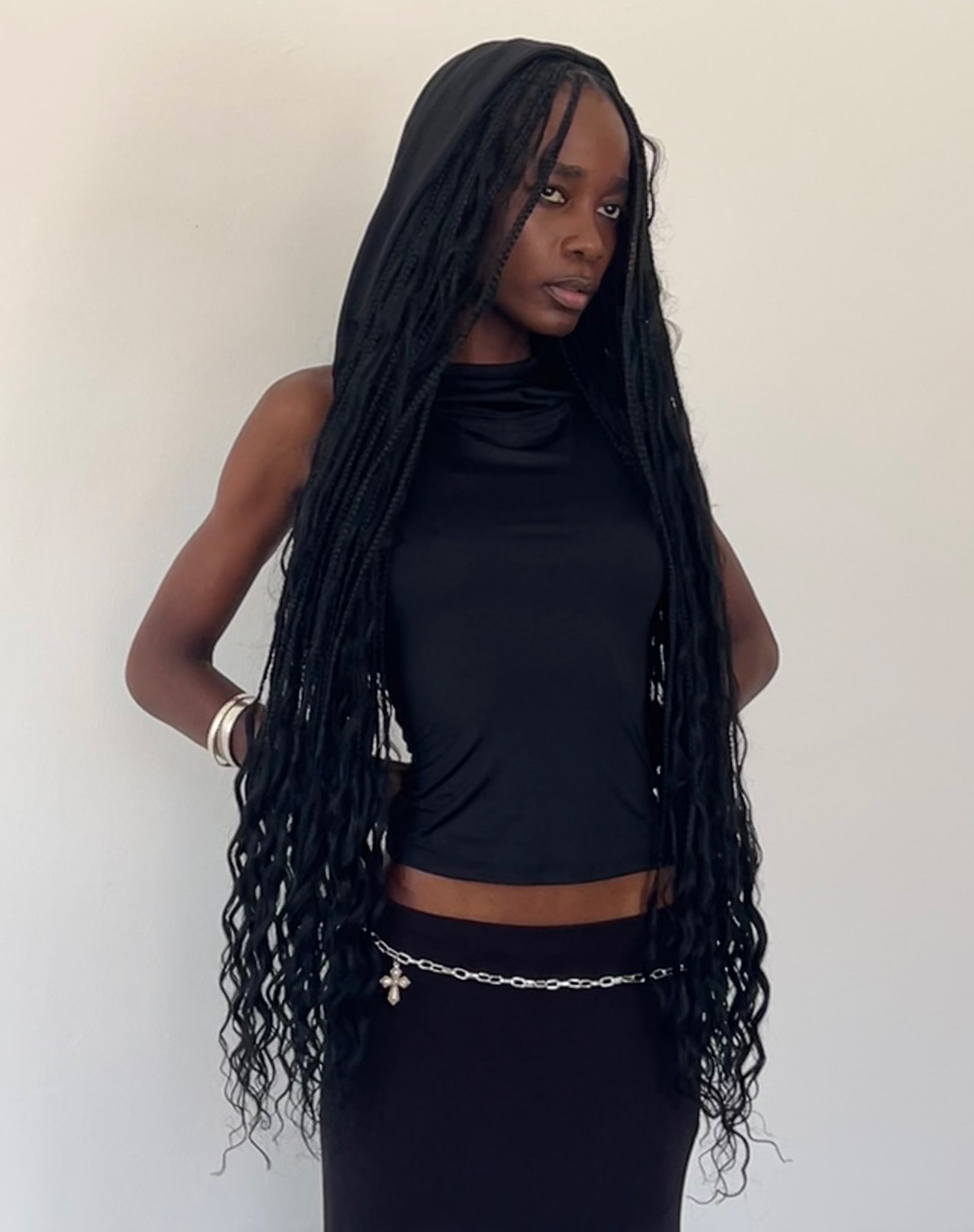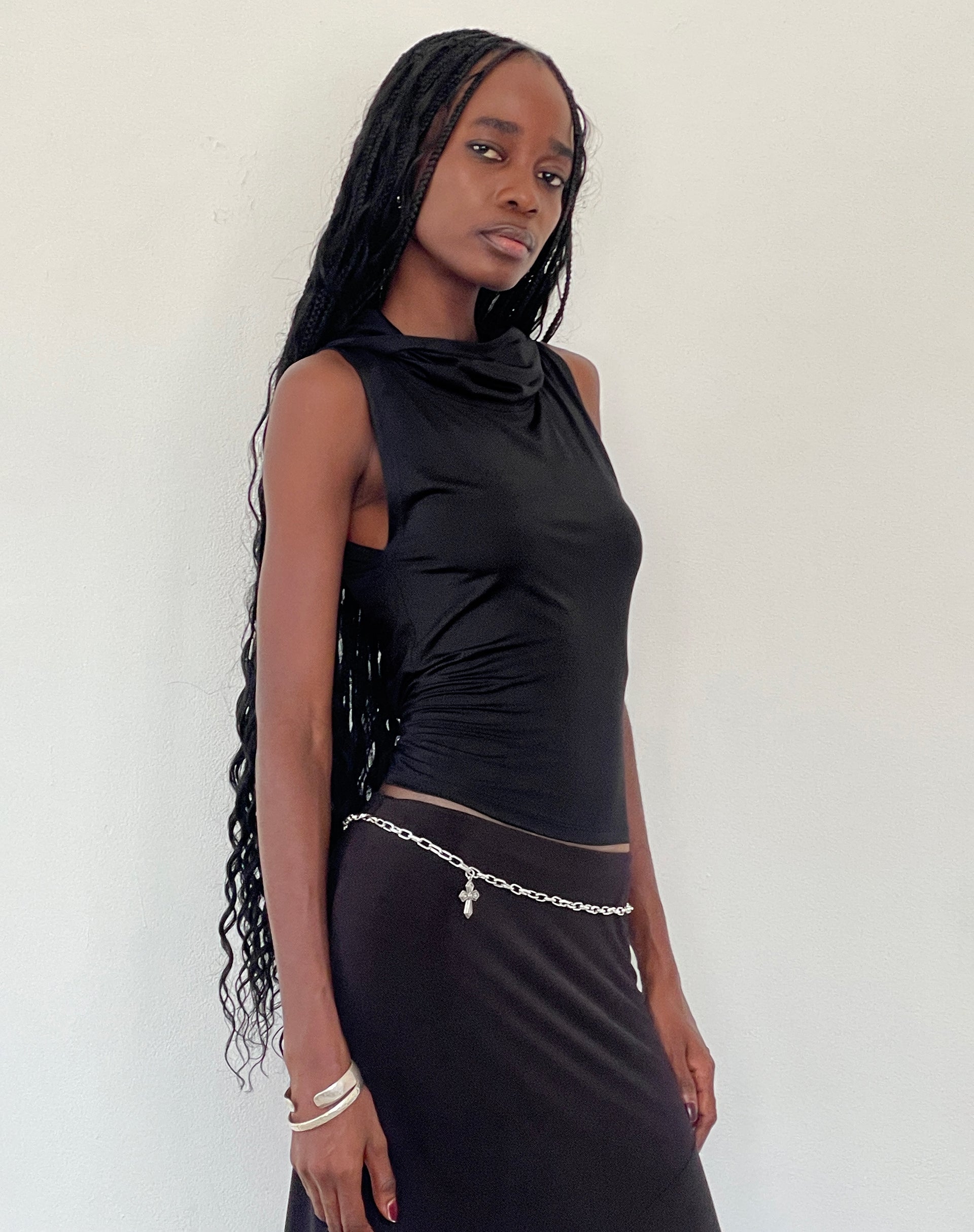 The Tapia tank top in a slinky black fabric. A sleeves slinky tank top with cropped fit, complete with hooded detail. Complete look with our Cinta skirt.