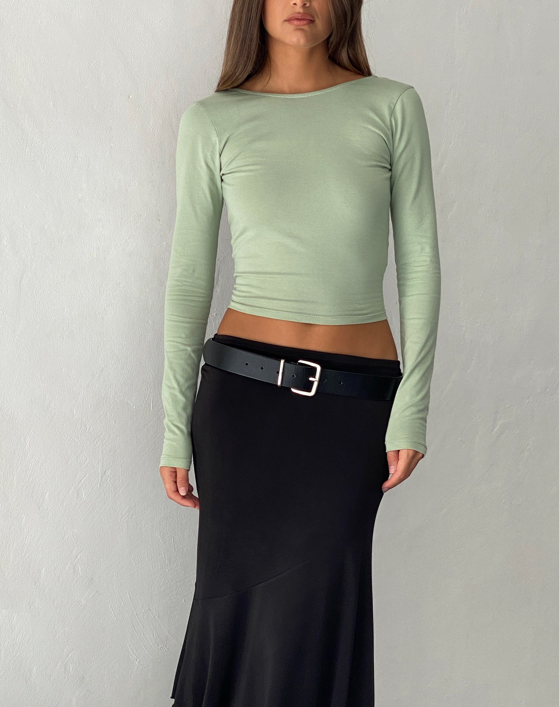 Level up your basics with our Xiabon top. Featuring a bodycon fit with long sleeves and a round neckline in desert sage. Complete with an open scoop back design. We love to style with our Cinta skirt in black.