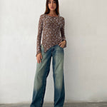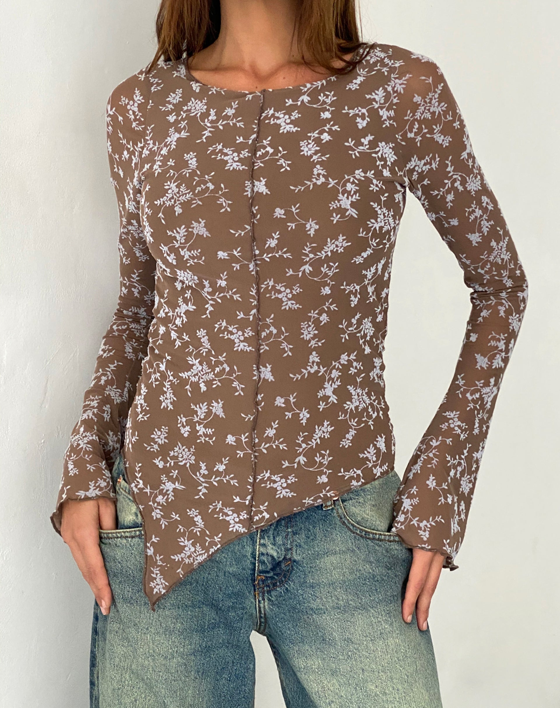 In a dark taupe mesh flock fabric, our Zest top features a bodycon fit with long sleeves, a boat neckline and an asymmetric lettuce hem. Detailed with a scattered floral print. Style with our Roomy jeans in extreme blue green.
